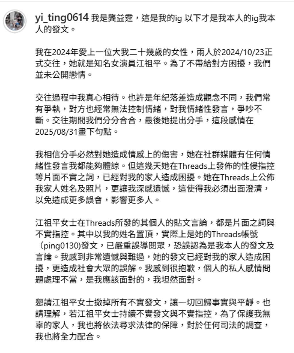 以下是目前可查證的、雙方都認(rèn)可的基本時間線與事實:事項信息戀愛關(guān)系龔益霆承認(rèn)與江祖平曾交往臺灣中時新聞網(wǎng)開始時間2024年10月23日正式交往臺灣中時新聞網(wǎng)結(jié)束時間2025年8月31日分手臺灣中時新聞網(wǎng)持續(xù)時間約10個月臺灣中時新聞網(wǎng)年齡差龔益霆稱江祖平比他年長二十幾歲臺灣中時新聞網(wǎng)公開狀態(tài)戀愛期間未公開,分手后由龔益霆公開臺灣中時新聞網(wǎng)分手原因龔益霆稱因年齡差距大、觀念不同、爭吵不斷所致臺灣中時新聞網(wǎng)除了上述基本信息,關(guān)于這段戀情,還有一些值得注意的情況:戀情由龔益霆主動公開:在江祖平于2025年9月初在社交媒體上指控龔益霆涉及性騷擾等不當(dāng)行為后1,龔益霆通過個人社交賬號發(fā)表聲明,主動承認(rèn)了兩人曾有過這段戀情。他稱此前未公開是“為了不帶給對方困擾”。江祖平的間接承認(rèn):對于龔益霆“曾交往”的說法,江祖平并未直接否認(rèn)。她后續(xù)的多次發(fā)文和爆料,內(nèi)容均涉及兩人交往期間的細節(jié),這從側(cè)面印證了他們確實存在過戀愛關(guān)系。目前的情況是,雙方對于這段關(guān)系的描述和分手后的指控存在巨大分歧:龔益霆承認(rèn)戀情,但否認(rèn)了江祖平關(guān)于性侵、偷拍等所有指控,稱其為“片面不實之詞”。江祖平則指控龔益霆在交往期間及分手后存在多項不當(dāng)行為。目前,檢警已介入調(diào)查此事,最終的事實認(rèn)定需要等待司法機關(guān)的調(diào)查結(jié)果。