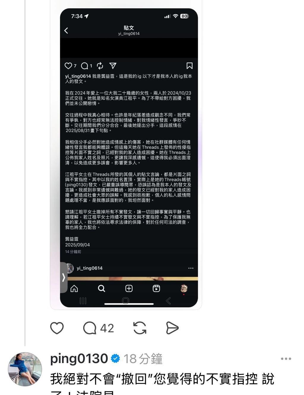 2025年8月18日,47歲的臺灣女演員江祖平突然在社交平臺發(fā)文稱,自己收到一名女性朋友的私信,指控遭到電視臺關(guān)系人士性侵并偷拍。江祖平強調(diào):“這是真實發(fā)生的,請重視?!辈⑼嘎渡姘改凶觼碜噪娨暸_體系內(nèi)部。她直言對朋友十分心疼,但同時也因事件牽涉到龐大的電視臺資源,讓她滿是無力感。9月初,江祖平連續(xù)發(fā)文曝料稱,涉嫌性侵者為三立副總龔美富的兒子龔益霆。但龔益霆發(fā)文稱,兩人是男女朋友,性侵指控為片面不實之詞。