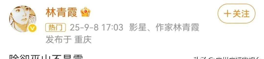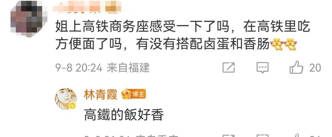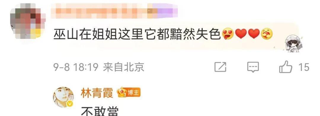 同日,有网友发帖称,自己一家人在巫山游玩时偶遇了林青霞,并晒出与林青霞的合影。照片中林青霞笑容灿烂,看起来状态非常好。网友还称,在巫山碰到童年女神很梦幻,林青霞本人非常亲切,很喜欢小朋友,还给她儿子拍了很多照片。一晚连续更条社媒对林青霞来说实属罕见更让影迷们惊喜的是,当晚,她回复多条网友留言,言语间透露着开心。有网友问,“高铁里吃方便面了吗?”林青霞答:“高铁的饭好香”。有网友调侃,“姐姐好像有点疯了?!?#26519青霞以“哈哈哈”回复。
