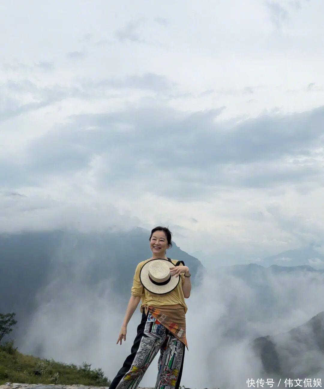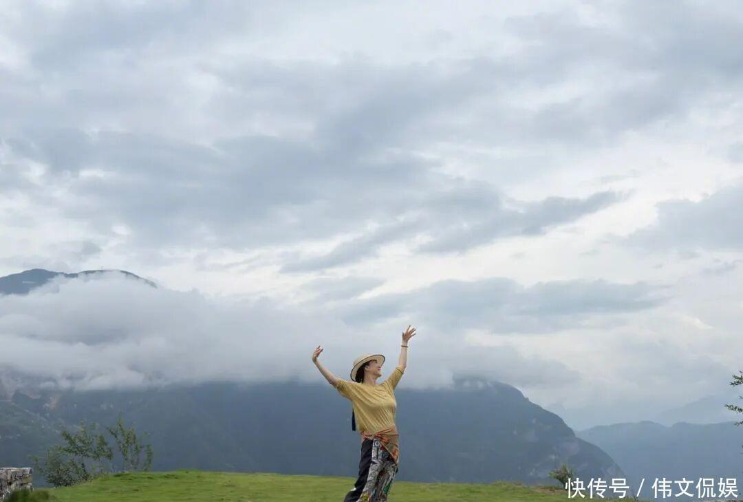 有在巫山旅游时,双臂伸展舞蹈的照片,她配文:除却巫山不是云。