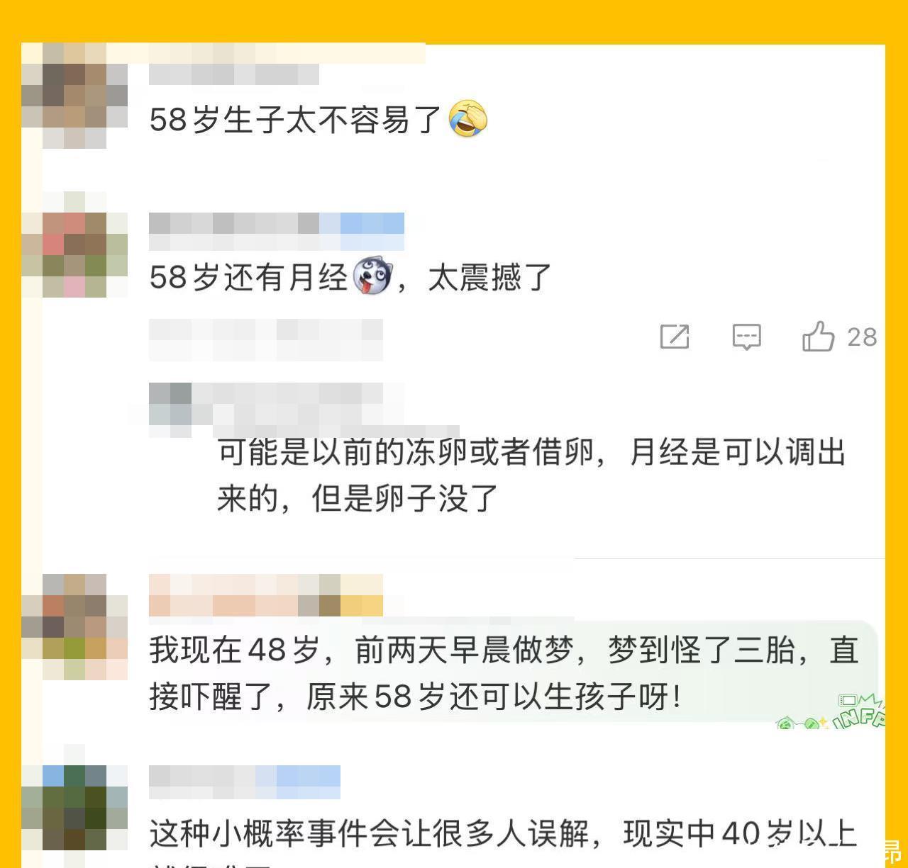 “58歲還有月經(jīng),太震撼了。”“我現(xiàn)在48歲,前兩天早晨做夢,夢到怪了三胎,直接嚇醒了,原來58歲還可以生孩子呀?!薄斑@種小概率事件會讓很多人誤解,現(xiàn)實(shí)中40歲以上就很難了?!本W(wǎng)友的震驚也是可以理解的。因?yàn)楦啐g生育真的不容易,這種超高齡生育,則更是艱難。①為什么58歲還能生孩子?女人有最晚的生育年齡嗎?答案是有的。首先,我們來聊聊今天熱搜的58歲產(chǎn)女事件。這確實(shí)是一個醫(yī)學(xué)上的奇跡,但我們必須清楚地認(rèn)識到:這是一個極其特殊的個例,遠(yuǎn)遠(yuǎn)超出了普遍的醫(yī)學(xué)建議范圍,絕對不應(yīng)該被視為常態(tài)或目標(biāo)。女人的最晚生育年齡,有標(biāo)準(zhǔn)答案,但有科學(xué)界限。第一:自然生育的極限1、生理極限:絕經(jīng)女性的卵巢就像一個小倉庫,里面的卵泡(卵子的前身)數(shù)量是一出生就決定了的,不可再生,只會隨著每次月經(jīng)周期而消耗。當(dāng)卵泡耗竭,卵巢功能衰竭,女性就會絕經(jīng),標(biāo)志著自然生育能力的終結(jié)?!裰袊云骄^經(jīng)年齡:通常在 45-55歲 之間,平均約為49.5歲?!襁@意味著:絕大多數(shù)女性在50歲以后,就完全失去了自然懷孕的可能。2、生育能力也是逐年衰退的生育能力不是在絕經(jīng)那天突然消失的,而是一個漫長的衰退過程?!顸S金期:25-29歲。卵子數(shù)量多,質(zhì)量高,身體機(jī)能好,孕期并發(fā)癥風(fēng)險最低?!裣禄冢?5歲是一個重要的醫(yī)學(xué)分水嶺。從這個年齡開始,被定義為“高齡產(chǎn)婦”。卵子質(zhì)量和數(shù)量都呈斷崖式下跌,懷孕幾率顯著下降,流產(chǎn)率和胎兒染色體異常風(fēng)險顯著升高?!窦眲∷ネ似冢?0歲以后。自然懷孕變得非常困難。40歲女性每個月的自然受孕幾率可能不到5%。到了45歲,很多女性其實(shí)已經(jīng)進(jìn)入了“圍絕經(jīng)期”(絕經(jīng)前的過渡階段),自然生育幾乎不可能??偨Y(jié)來說:從自然生育角度看,女性的最晚生育年齡通常以絕經(jīng)為終點(diǎn),實(shí)際有效的自然生育年齡上限大多在45歲左右。