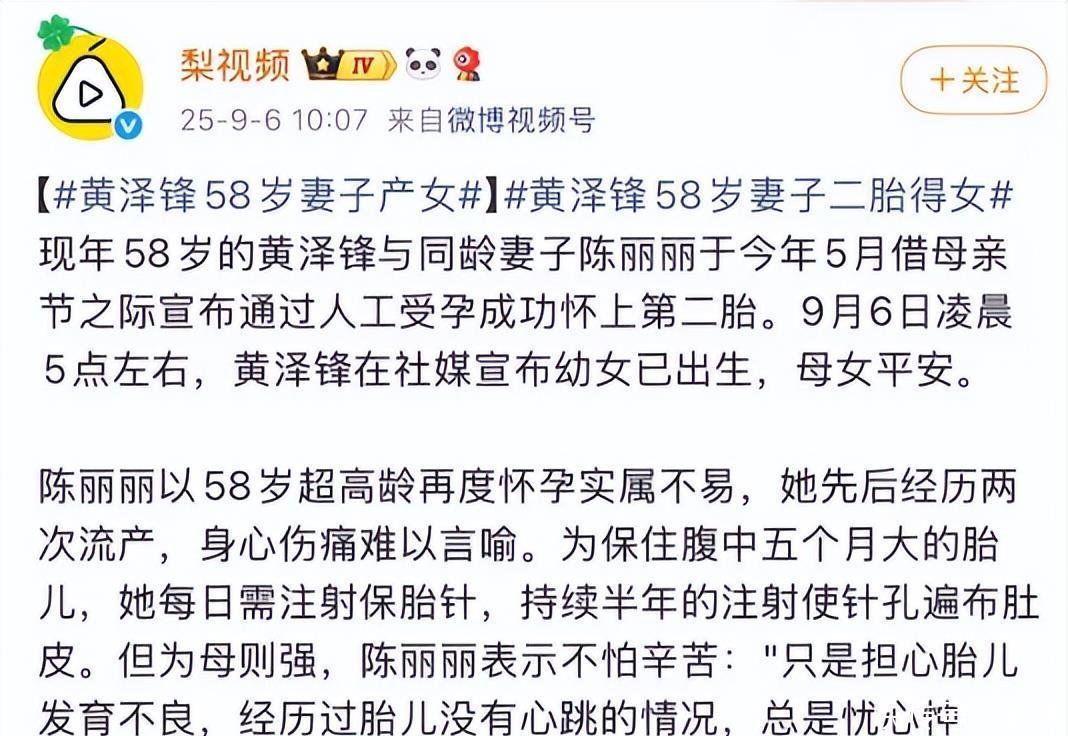 女人是有最晚生育年齡的。從自然生育的角度出發(fā),最晚的生育年齡是以絕經(jīng)為終點(diǎn)的,這通常在45-50歲左右。但近日的一則新聞,卻讓網(wǎng)友們紛紛感嘆:原來58歲還可以生孩子。前TVB演員黃澤鋒在昨天官宣了妻子生下二胎女兒的消息,妻子陳麗麗和他同歲,都是58歲。