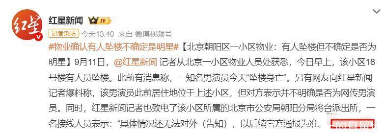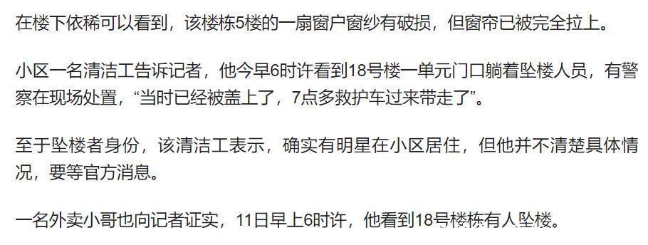 有媒體聯(lián)系了涉事小區(qū),小區(qū)的物業(yè)人員表示該小區(qū)18號樓的確有人墜樓,但不清楚是不是網(wǎng)傳的明星。