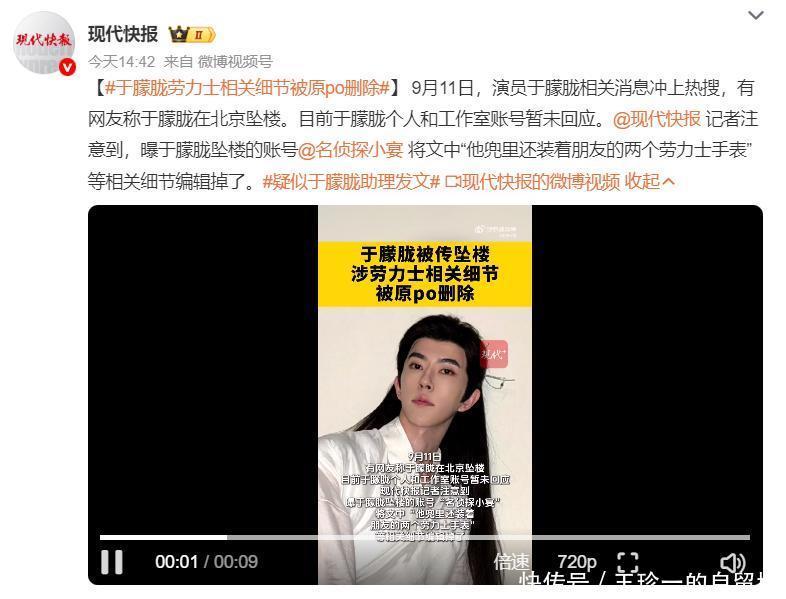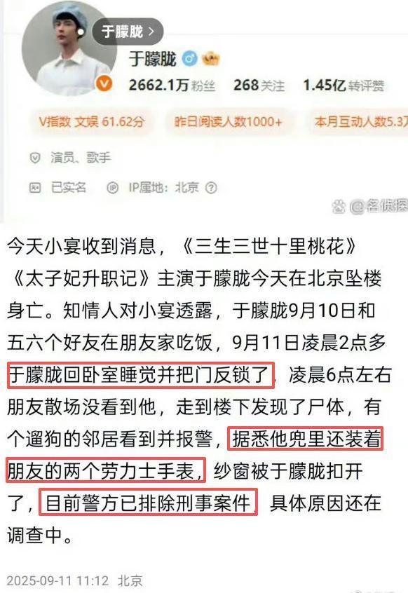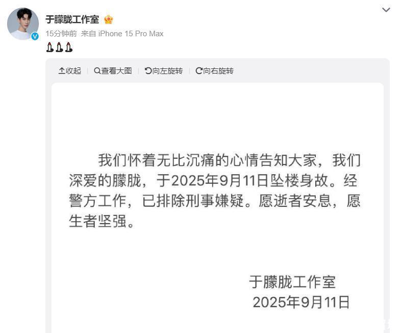 根據(jù)工作室的發(fā)文可知,于朦朧9月11日墜樓身亡,經(jīng)警方工作,已排除刑事嫌疑。