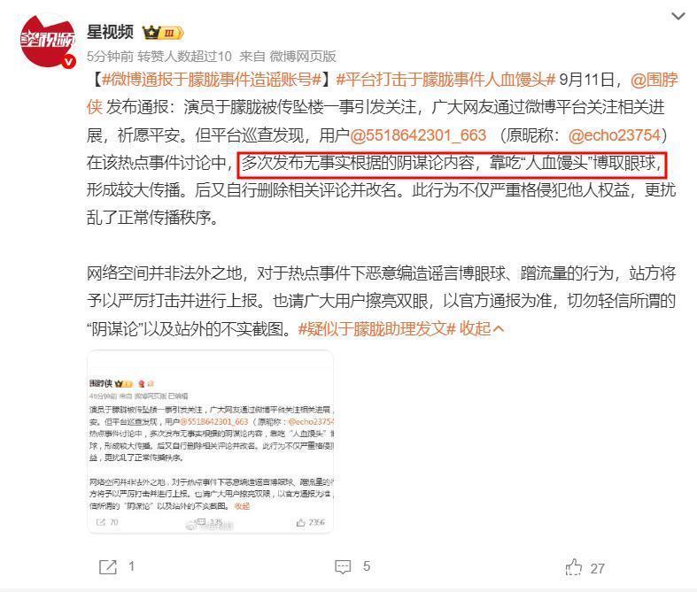 第一件事情是有人對于朦朧造黃謠,對他被傳墜樓一事進(jìn)行陰謀論。