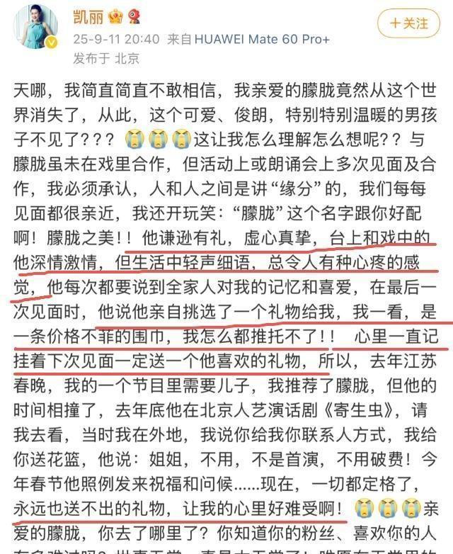 37歲演員于朦朧墜亡后,62歲張凱麗發(fā)文悼念,公開兩人最后見面時送圍巾、邀看話劇等細節(jié),文中“沒有下次”的遺憾讓網(wǎng)友淚目,其低調(diào)善良的生前事也被翻出。