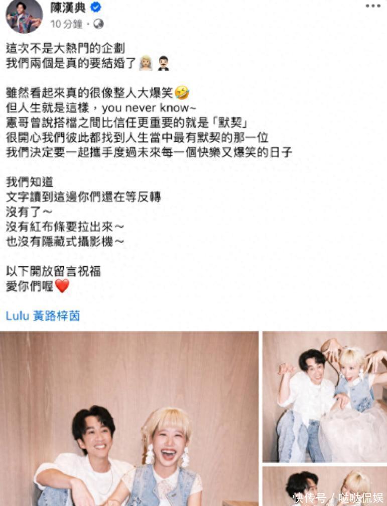 陳漢典曬出多張合照,并配文:這次不是大熱門的企劃,我們兩個(gè)是真的要結(jié)婚了!雖然看起來(lái)真的很像“整人大爆笑”,但人生就是這樣,you never know~兩人曾在綜藝節(jié)目中上演搞笑的結(jié)婚橋段,吳宗憲充當(dāng)節(jié)目中的證婚人。不料,當(dāng)初的段子竟然成了真。