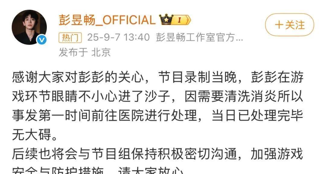 当日,彭昱畅工作室发文回应:感谢大家对彭彭的关心,节目录制当晚,彭彭在游戏环节眼睛不小心进了沙子,因需要清洗消炎所以事发第一时间前往医院进行处理,当日已处理完毕无大碍。后续也将会与节目组保持积极密切沟通,加强游戏安全与防护措施,请大家放心。