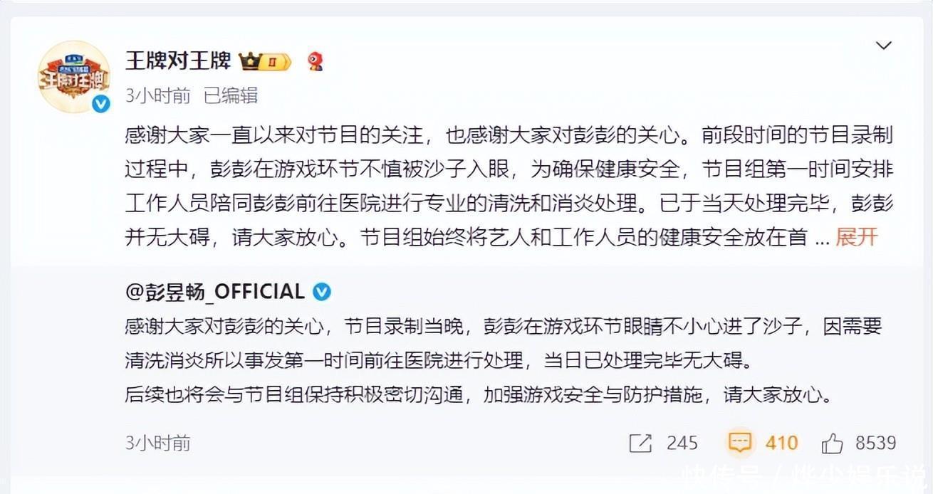 不久后,《王牌对王牌》节目组也发布声明,证实彭昱畅是在游戏环节不慎被沙子迷眼。为保障其健康安全,节目组第一时间安排工作人员陪同他前往医院,进行专业清洗和消炎处理,当天处理完后彭昱畅身体状况良好,请大家放心,并强调始终将艺人和工作人员的健康安全放在首位。