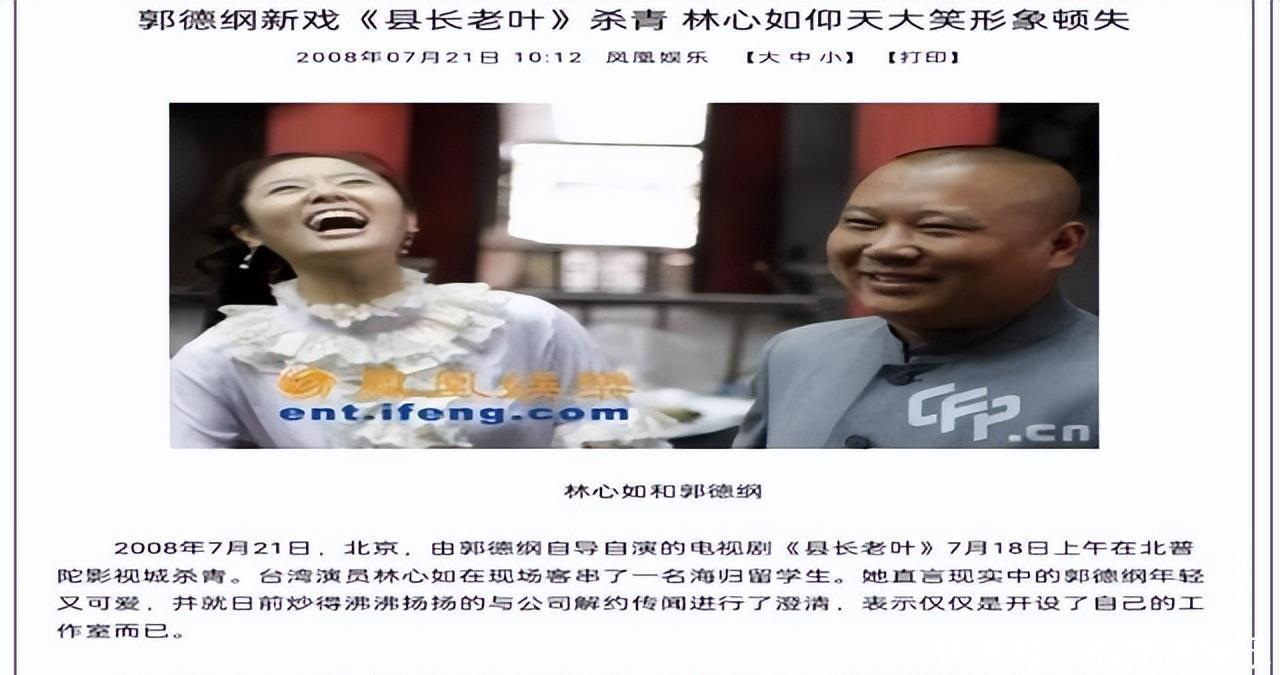 俩人怎么搭上线的?得从林志颖说起。郭德纲和林志颖同岁,早年就认识,1994年林志颖和林心如拍戏相恋,俩人分手后还友好。郭德纲通过这层,2008年请林心如客串他自导的剧《知县叶光明》,又叫《县长老叶》,她在里头演海归留学生,戏份不多,但合作愉快。杀青时媒体拍到她大笑,郭德纲现场指挥。