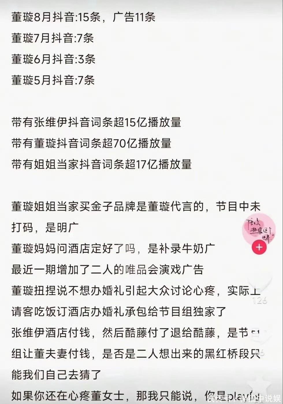 果不其然,董璇这边刚靠着《姐姐当家》里和张维伊的婚姻话题收割一波 “黑红” 热度,转头就马不停蹄的做起了直播带货! 网友们劝你们一句哈,别跟个傻子一样心疼董璇了!你看人都带上货了,闺女小酒窝也火了,所有的黑锅张维伊背了,但是他也火了不是(黑红也是红)一部综艺《姐姐当家》让她们全家都火起来了,让董璇又进入大众视野,活动也多了许多!凭着《姐姐当家》董璇收获了全中国网友的心疼和数不清的商务,而她老公张维伊收获了知名度和曝光度让更多人认识和知道了他,女儿小酒窝呢收获了好感和曝光度,这不连电影都演上了!而节目组呢,获得了点击率赚的盆满钵满,只有我们这些真实情感的网友收获了满满的坏情绪♂网友们心疼这个心疼那个,到最后发现过的都比自己好,扯不扯淡呢你还真别说,董璇这波操作简得飞起啊!都说董璇傻恋爱脑,其实傻的只有我们这些网友!咱们跟个s子一样替人家的婚姻操碎了心,人家呢,眼睛里就只盯着那白花花的银子,当我看到董璇开始直播带货了,就知道你们在那边浪费情绪骂她老公有多搞笑了#董璇##张维伊##姐姐当家##董璇张维伊#