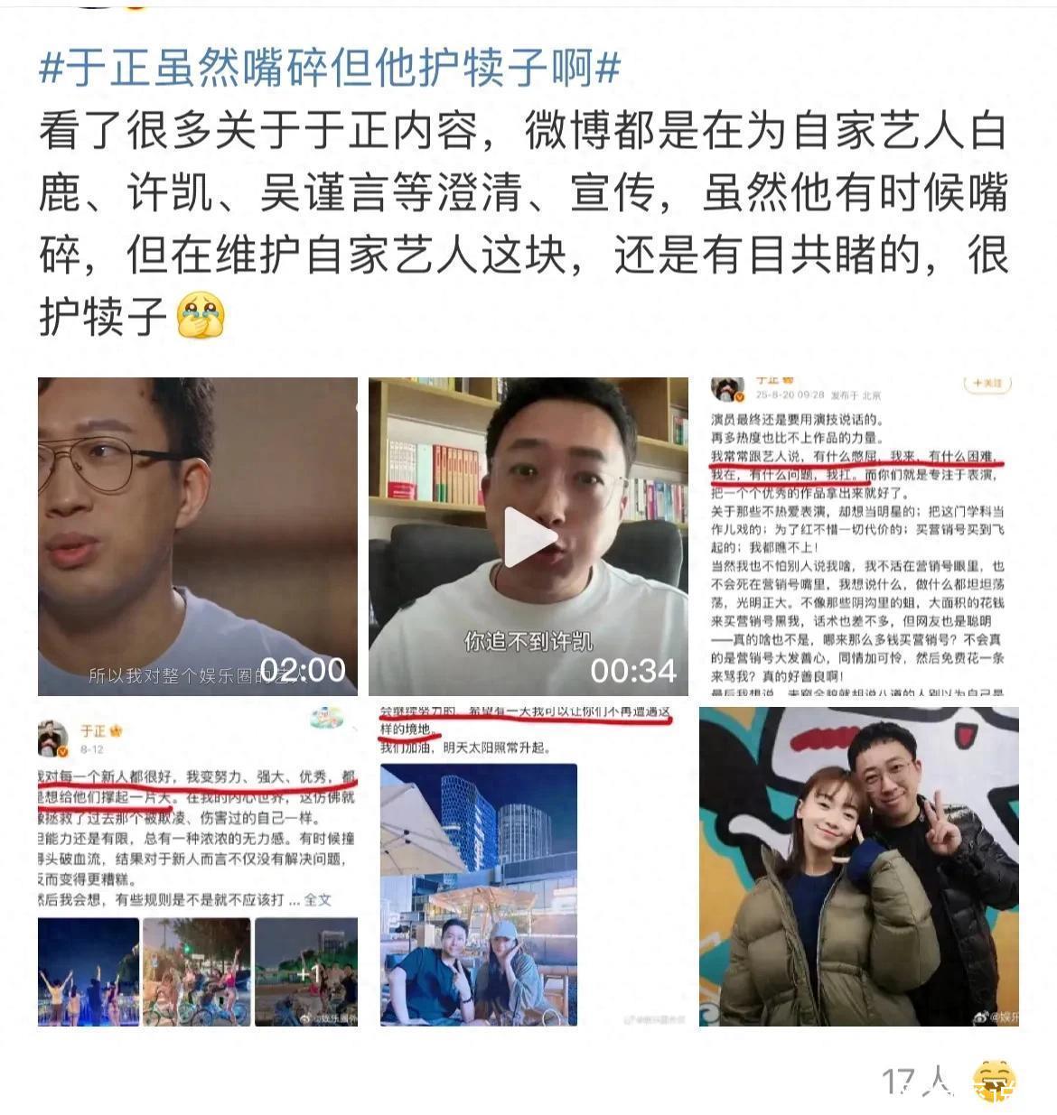 多次給許凱及旗下藝人澄清黑料,宣傳新劇。不管于正的嘴有多碎多臭,但于正在護犢子這塊真是特別突出的。