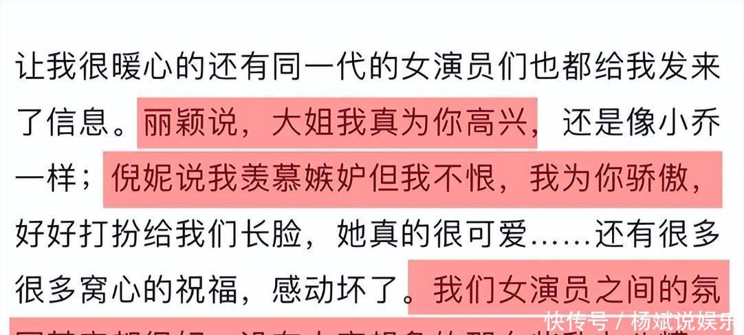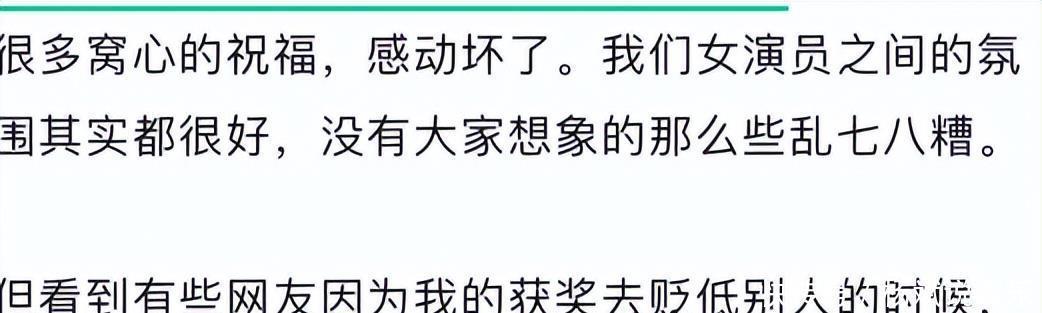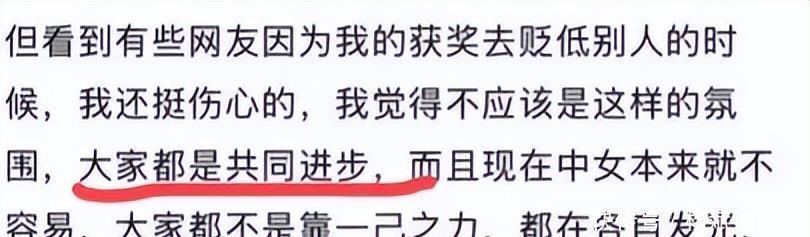 還說(shuō)看到一些網(wǎng)友用自己得獎(jiǎng)去貶低別人的時(shí)候,自己挺傷心的,她覺(jué)得不應(yīng)該是這樣的氛圍,大家都應(yīng)該是共同進(jìn)步的,本來(lái)她們中女就不容易,大家都不是靠一己之力,都在各自發(fā)光!
