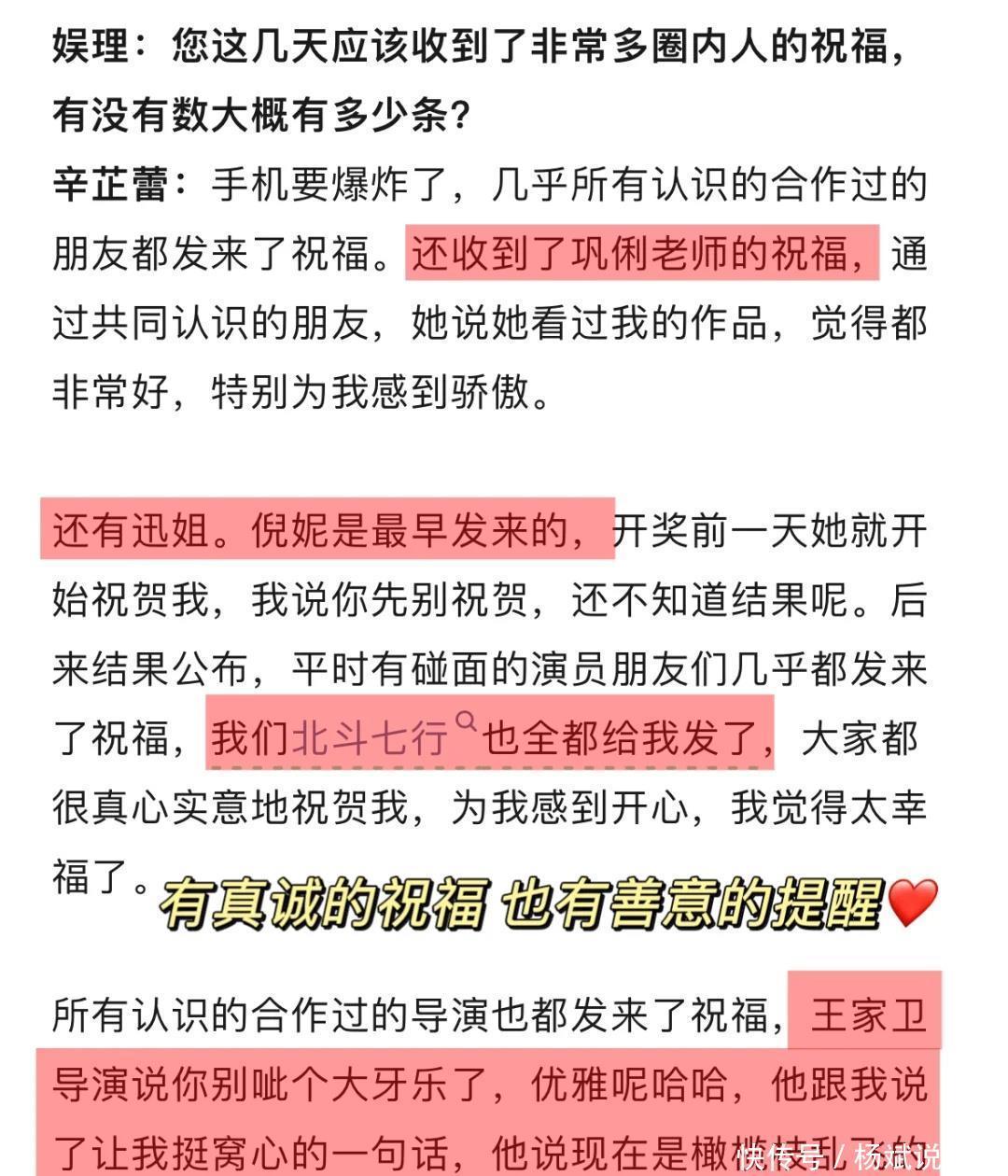 還有之前合作的導(dǎo)演們,也都為辛芷蕾送上了祝福,曹保平導(dǎo)演和倪妮一樣,早在開獎(jiǎng)之前就恭喜上辛芷蕾了,說(shuō)相信辛芷蕾的能力。而王家衛(wèi)導(dǎo)演的祝福最實(shí)用,他告訴辛芷蕾現(xiàn)在肯定是有很多橄欖枝拋給辛芷蕾,但辛芷蕾自己一定不能忘記初心,辛芷蕾說(shuō)這對(duì)自己很有用。