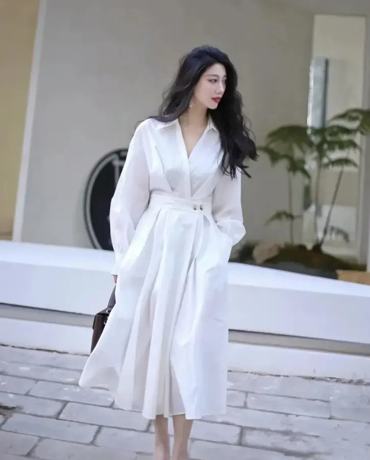 當然啦,我們還可以直接來一件襯衫連衣裙,像下面這種裙子,一件衣服搞定全身,再組合上大波浪的卷發(fā)造型,發(fā)出了御姐的女神氣質(zhì)范。
