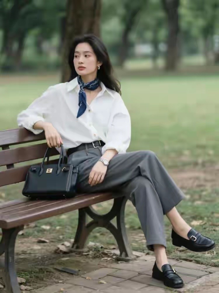 可能你會覺得選擇彩色系的褲子來穿搭會不好搭配,畢竟不是誰都有這么好的膚色,確實如此,皮膚白嫩的女性,很多彩色系的衣服都可以輕松駕馭,對于皮膚偏暗黃的女性,我們還不如選擇最為基礎(chǔ)的白色襯衫搭配上灰色的西褲,腳上穿的是黑色的樂福鞋,這樣的穿衣打扮會更干練更好看。