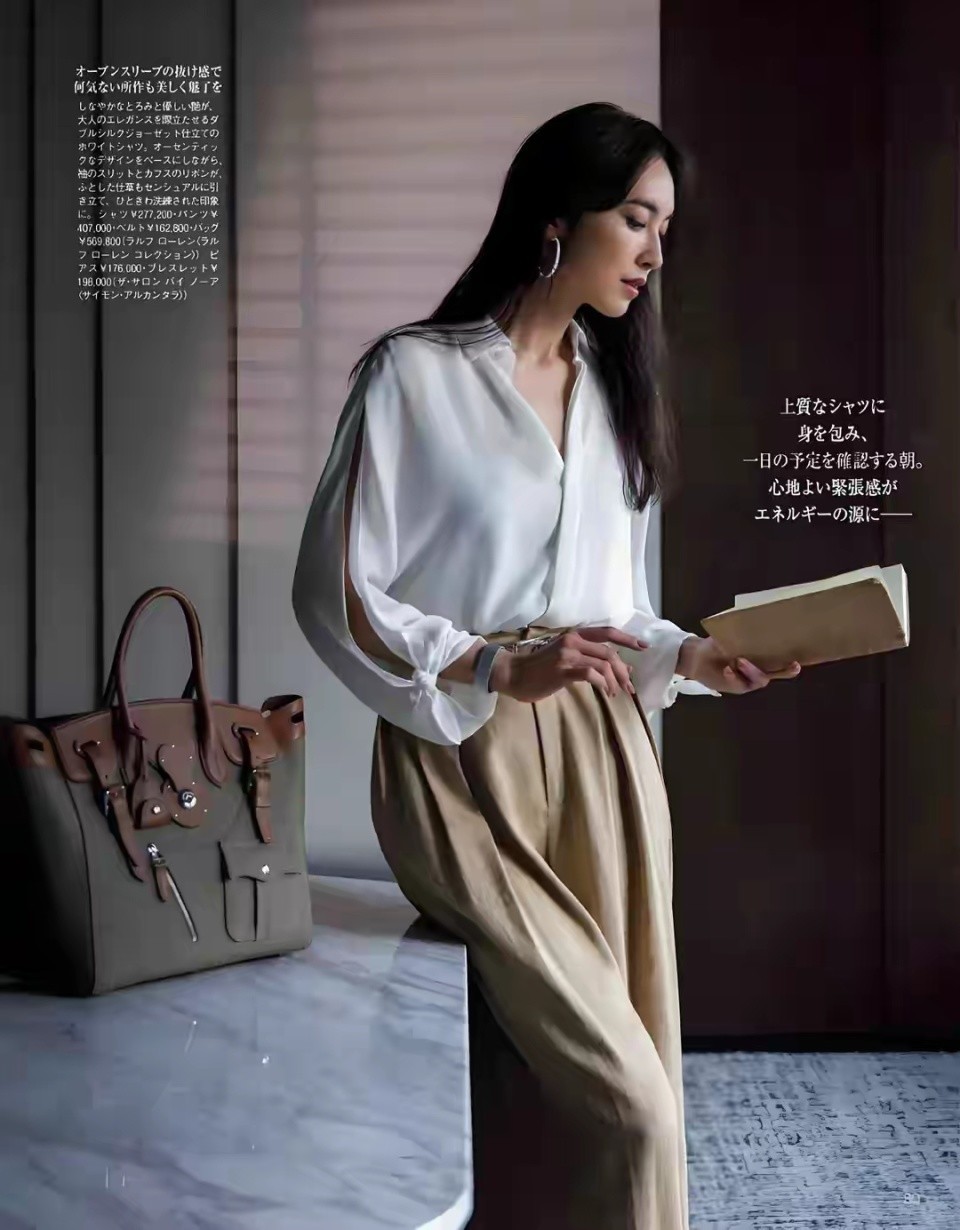 這時候我就比較推薦大家選擇比較經(jīng)典的色調(diào),那就是卡其色,卡其色的西裝褲穿在身上很時尚,也很有品位,同時,這個顏色不容易掉色,耐穿還很好搭配,像這位達人,像直接搭配一件個性十足的開叉袖子設(shè)計襯衫,這樣的穿搭很適合奔三奔四的職場女性。