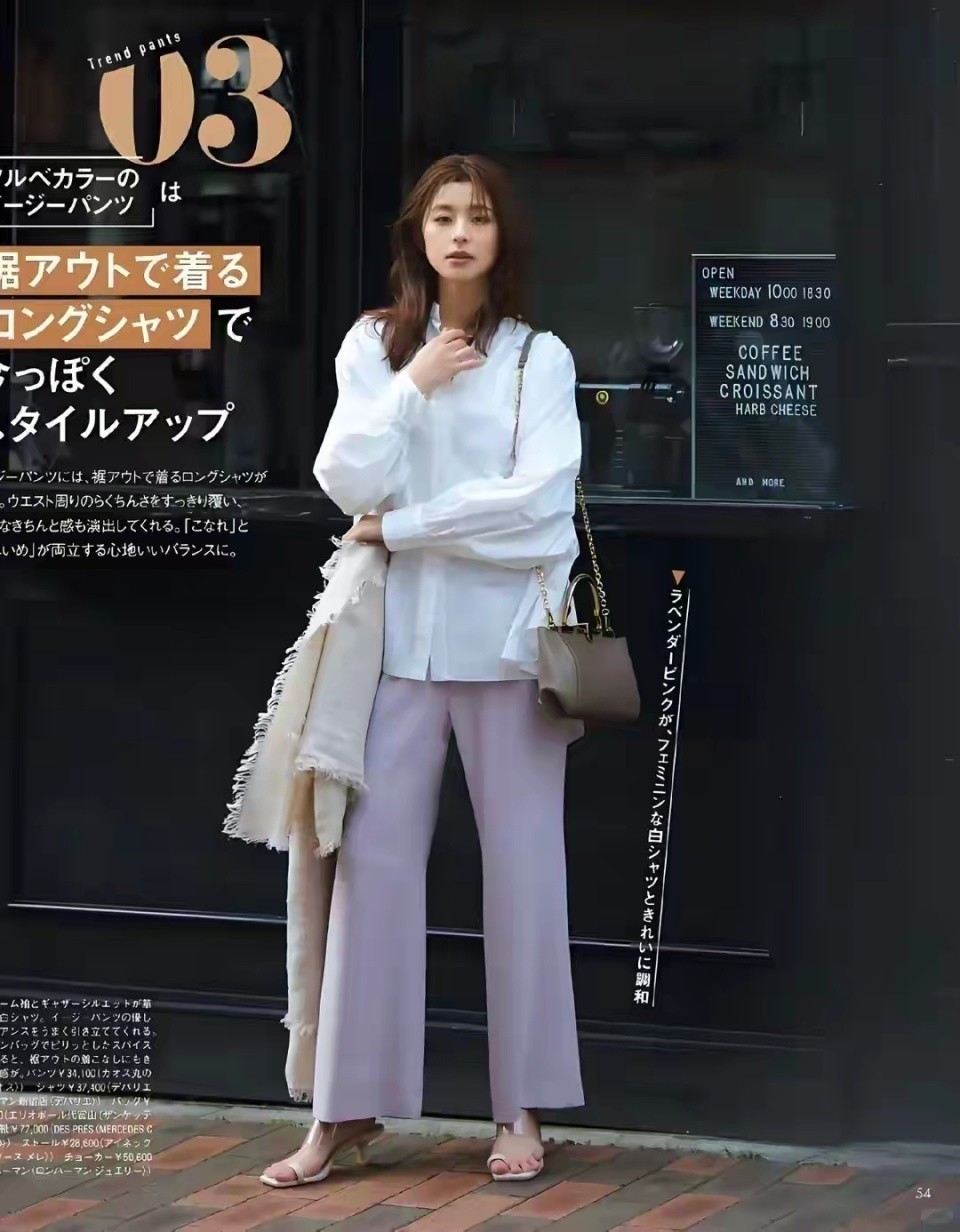 白色襯衫確實百搭,但有的時候可能穿白色會過于單調(diào),可以在外套或者是褲子,鞋子的色彩上下點功夫,例如下面用一件淺綠色的西裝褲,還有霧霾藍的高跟鞋來搭配上白色的襯衫,讓整體的穿衣風格色彩變得比較有飽和度,使得穿搭者看起來更年輕。