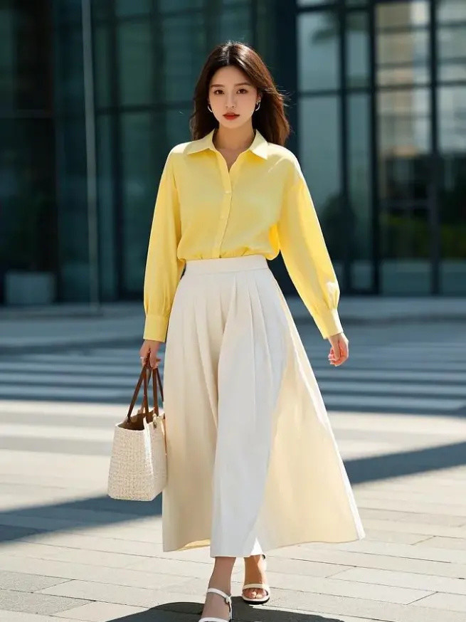 想要變得更加優(yōu)雅得體,選擇襯衫搭配上裙子確實是一個很好的搭配方式,也不是說所有的裙子搭配上襯衫就能很好看,比如下面用一件黃色的襯衫搭配上白色的傘狀半身裙,穿起來干練又得體,而且顯得年輕,沒有暴露自身的生產(chǎn)缺陷,主要的就是選擇的襯衫和裙子都是屬于寬松款,能很好的把胯寬,腿粗,腰間的贅肉小肚腩藏起來。