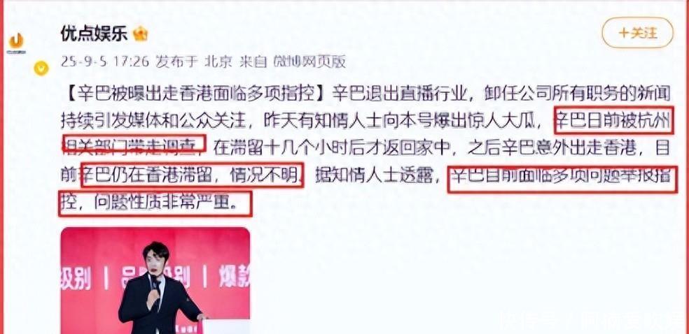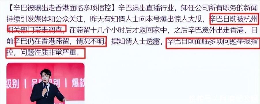 才刚把小杨哥和东北雨姐敲打一番“快手一哥”辛巴就又出事了前几天大伙儿还在讨论辛巴突然宣布退网是不是又玩“狼来了”结果这才消停不到十几天直接爆出更猛的料有媒体说辛巴被相关部门带走调查了甚至人还滞留在香港回不来