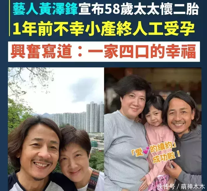 近日,香港男星黄泽锋通过社交平台宣布喜讯:58岁妻子陈丽丽已顺利生下二胎女儿!在报喜的同时,他还晒出一家四口照片,幸福喜悦的心情溢于言表。