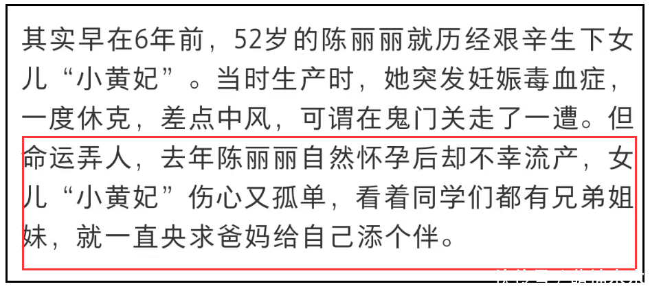 经过一年时间备孕后,陈丽丽成功怀孕,这个岁数能够自然怀孕很罕见,夫妻俩一度很小心。可惜由于高龄和体质等各种原因,当岁的陈丽丽还是小产了。