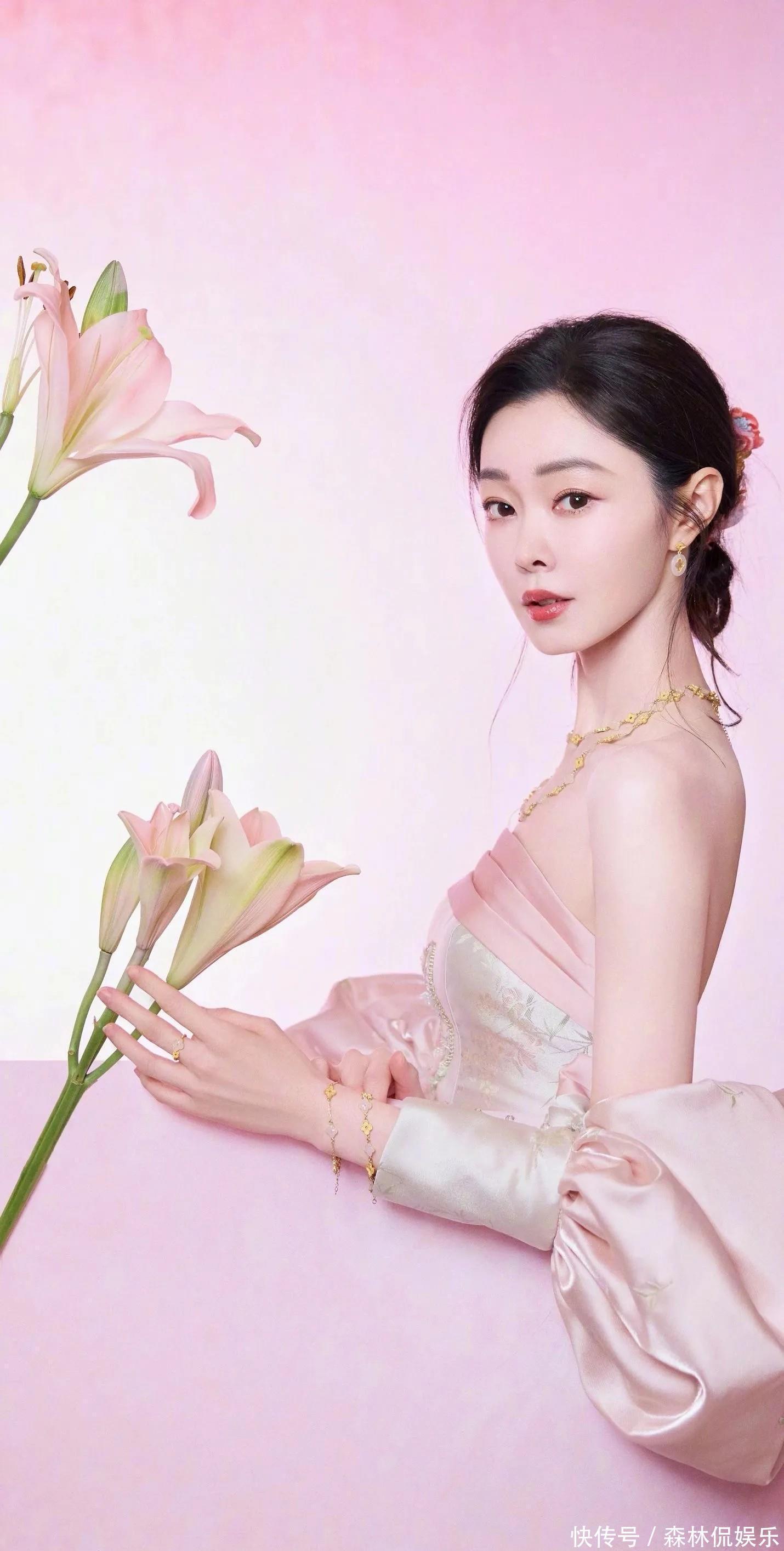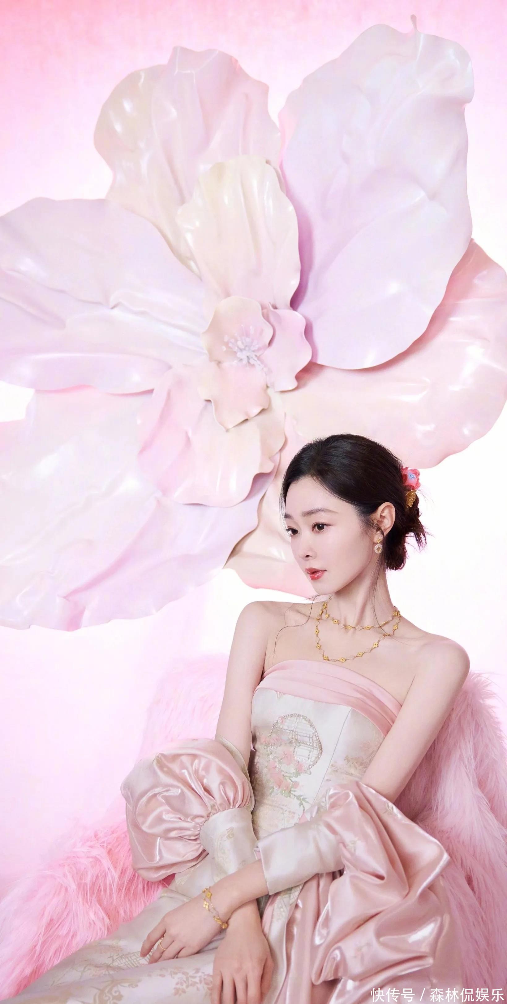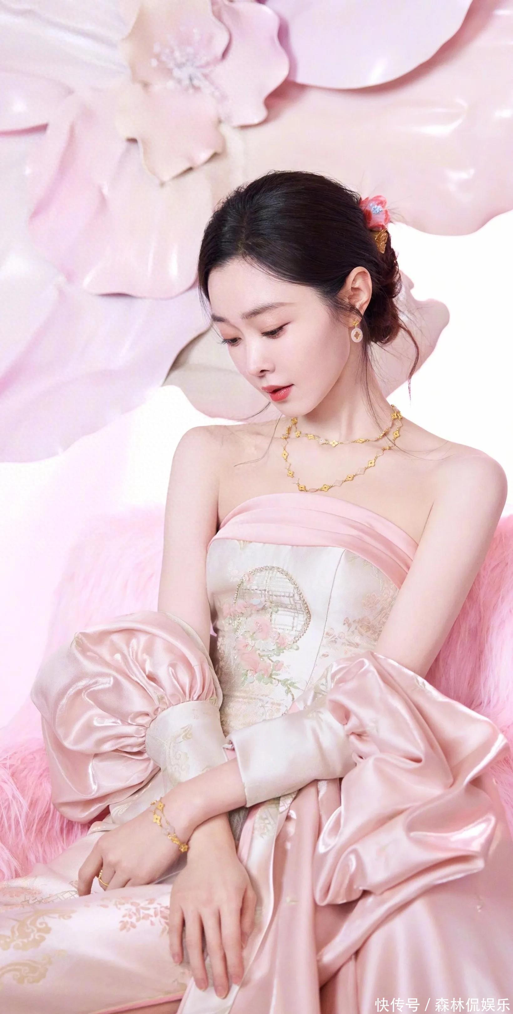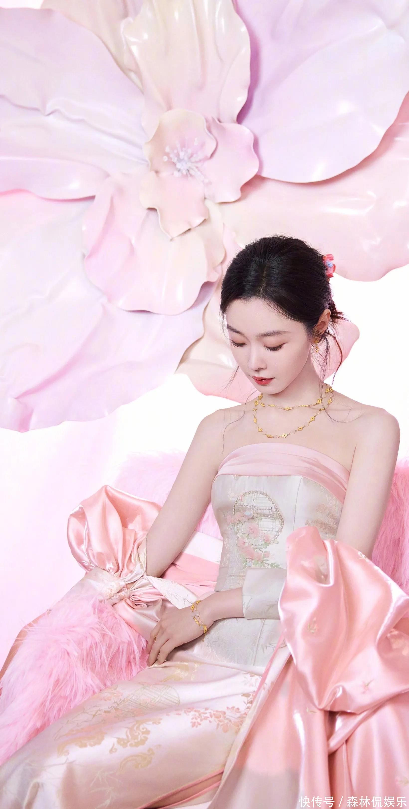 宋軼這次的粉色系造型太驚艷了!她穿著帶有精致花紋的粉色抹胸裙,搭配同色系的寬袖外套,坐在粉色的背景前,周圍還有大大的粉色花朵裝飾,就像從童話里的花境中走出來的公主一樣。