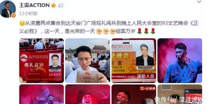王雷凌晨2點集合到達天安門廣場觀禮閱兵。閱兵結束后,晚上又到人民大會堂舉行的紀念抗戰(zhàn)勝利80周年93文藝晚會《正義必勝》,節(jié)目中王雷的表現(xiàn)非常突出,扮演的是一名鐵血硬漢。他還在社交平臺曬照,驕傲表示:這一天,是光榮的一天。
