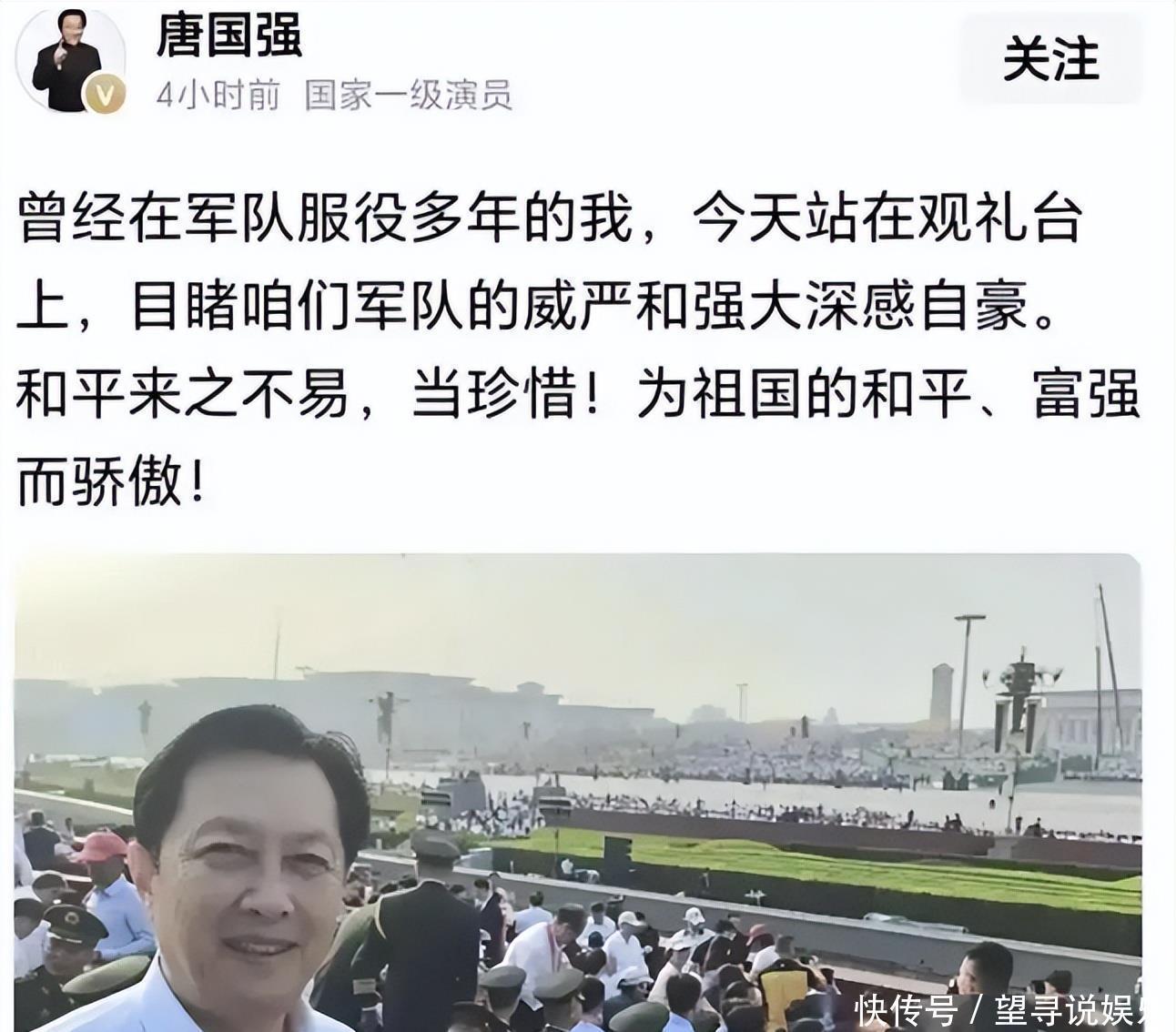 唐國強在個人社交發(fā)布了“九三閱兵”觀禮照片。他感悟道:曾經在軍隊服役多年的我,今天站在觀禮臺上,目睹咱們軍隊的威嚴和強大深感自豪。和平來之不易,當珍惜!為祖國的和平、富強而驕傲。文字下面,唐國強還配上了自己的觀禮照片,照片中他的頭發(fā)烏黑身著白襯衫,面帶微笑,精神抖擻。