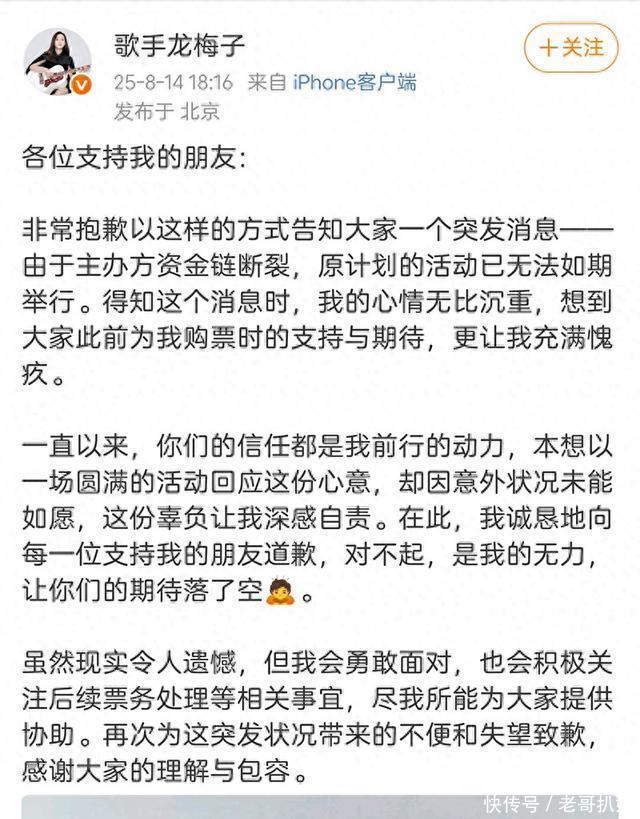 ?????? 現(xiàn)在流行舉辦演唱會(huì),無論藝人甚至網(wǎng)紅都想大撈一筆,不過老話說得好:“沒有金剛鉆,別攬瓷器活”,演唱會(huì)也不是說辦就能辦的,由于各種原因?qū)е卵莩獣?huì)翻車的例子屢見不鮮。?????? 今天要說的這位歌手更慘,演唱會(huì)還沒舉辦呢,主辦方就缺錢“跑路”了,責(zé)任到底在誰身上。?????? 對(duì)于歌手龍梅子,00、10后的小朋友應(yīng)該不太熟悉,80、90后或許有人還有一點(diǎn)記憶,她的代表作有《都說》《漂亮的姑娘就要嫁人啦》《有錢沒錢回家過年》和《下輩子做你的女人》等,雖然都很好聽,但是卻還沒到火遍大江南北的程度。?????? 平時(shí)不顯山不露水的,相信很多人都把龍梅子給忘了,這次忽然宣布要開個(gè)人演唱會(huì),或許早就注定結(jié)局不會(huì)太好。?????? 龍梅子發(fā)文告訴粉絲,稱由于主辦方資金鏈斷裂,導(dǎo)致演唱會(huì)無法如期舉行,對(duì)此表示非常遺憾充滿歉意。