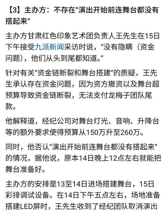 ?????? 目前龍梅子的經(jīng)紀(jì)人已經(jīng)把相關(guān)事宜交給律師處理,主辦方甘肅紅色印象藝術(shù)團(tuán)未來可能要吃官司了。?????? 不過主辦方在接受媒體采訪時(shí),又是一番甩鍋操作。負(fù)責(zé)人表示自己沒有隱瞞資金問題,龍梅子的經(jīng)紀(jì)公司完全知道實(shí)情。?????? 至于出現(xiàn)資金問題的原因,則是因?yàn)橘Y方撤資以及舞臺(tái)費(fèi)用超出預(yù)算所致。然而超出預(yù)算的原因,則是經(jīng)紀(jì)公司對(duì)舞臺(tái)燈光等提出額外要求,也就是說責(zé)任不在自己身上。?????? 對(duì)于“演出開始前連舞臺(tái)都沒有搭起來”的說法,主辦方表示原本可以在14日晚上12點(diǎn)左右就能準(zhǔn)備好的,不過經(jīng)紀(jì)公司在14日下午5點(diǎn)時(shí)就通知取消演出了。