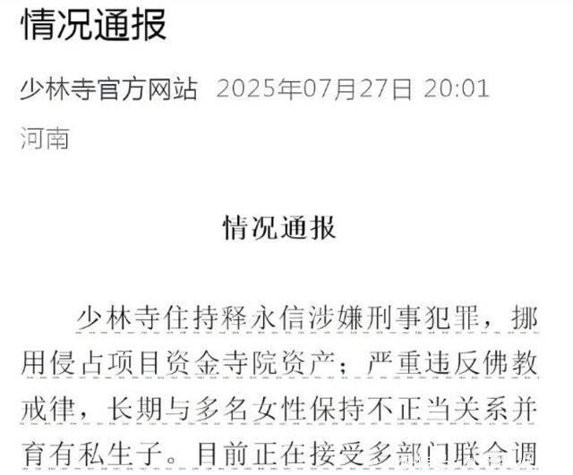 過了十年,釋永信這座“大佛”,終于被抓到了把柄。官媒在網(wǎng)站上通報(bào),少林寺的釋永信涉嫌刑事犯罪,貪污、愛女色,還有私生子,和尚不能做他占全了。