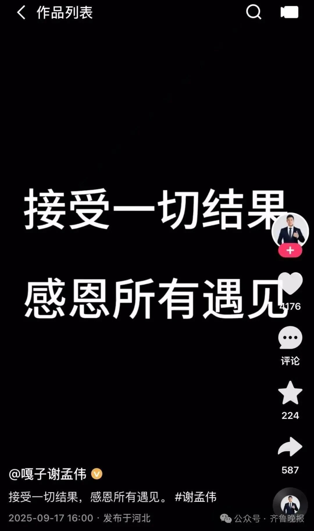 記者注意到,9月17日16時許,謝孟偉的社交賬號發(fā)視頻稱,接受一切結(jié)果,感恩所有遇見。