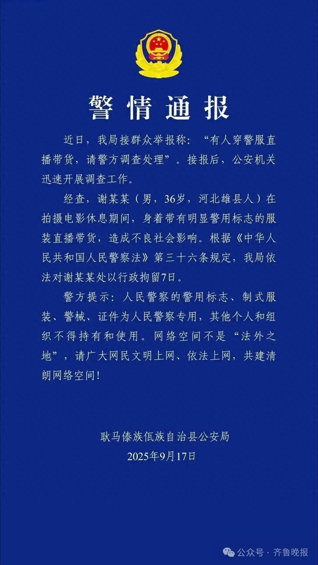 警方通報稱,謝某某(男,36歲,河北雄縣人)在拍攝電影休息期間,身著帶有明顯警用標(biāo)志的服裝直播帶貨,造成不良社會影響。根據(jù)《中華人民共和國人民警察法》第三十六條規(guī)定,我局依法對謝某某處以行政拘留7日。