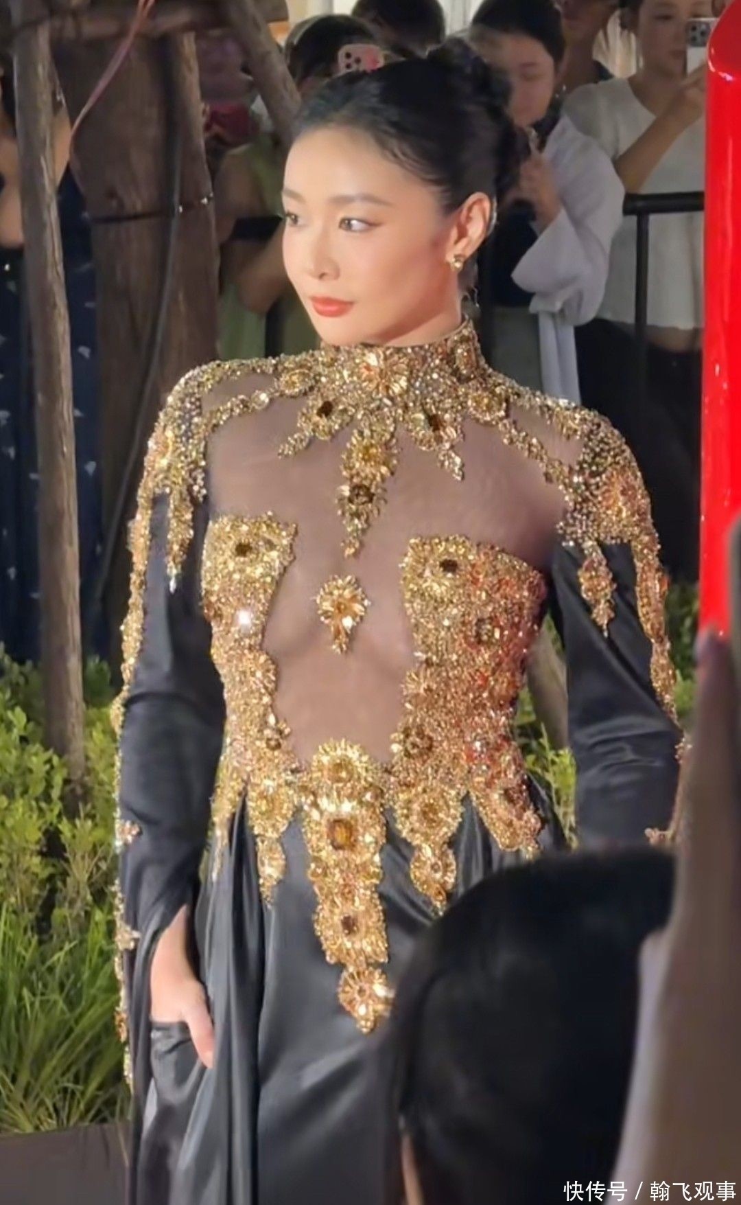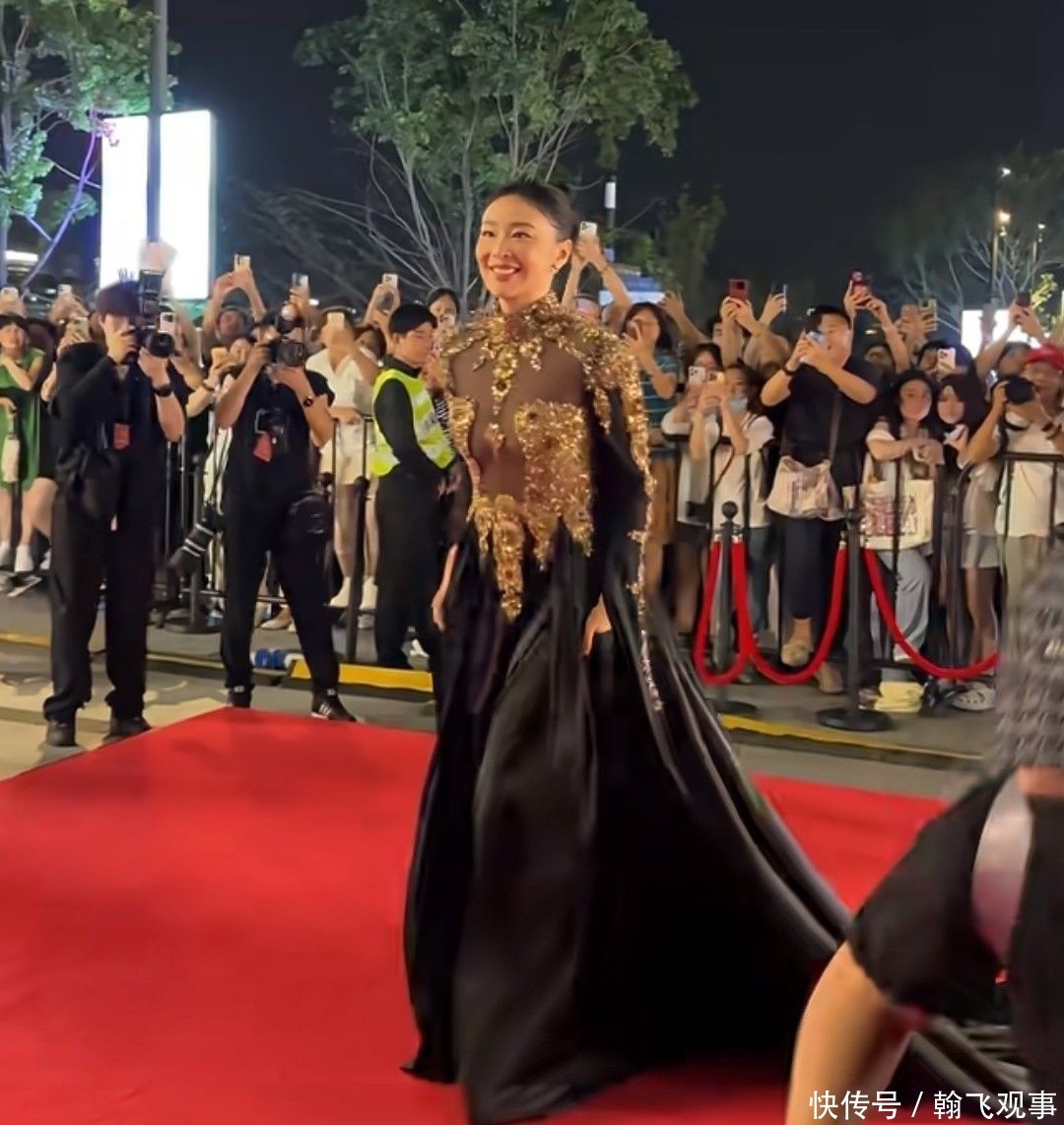 高叶当天身着金色亮片高领刺绣礼服现身,整体造型略显臃肿,缺乏以往“大嫂”时期的强大气场,反而略带车模风格。