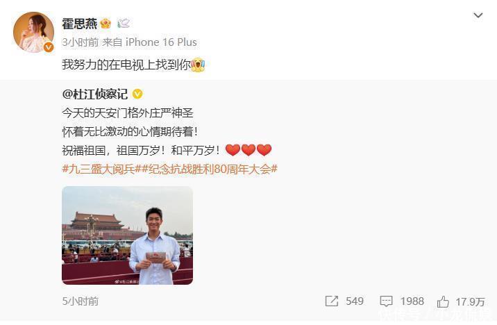 就日这天,杜江作为少数年轻演员代表受邀参加了这场国家级盛典,他在微博上晒出了手持阅兵邀请函站在观礼台上的照片,隔着屏幕都能感受到他发自内心的喜悦和自豪。杜江的老婆霍思燕也控制不住自己的喜悦之情,表示会努力在电视上找到他的身影,这种小细节真的很暖心,能感受到这对夫妻之间那种真挚的感情和相互支持。