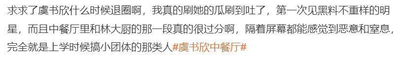 随后,更多节目旧料被扒出。比如虞书欣曾在节目中吐槽张昊玥“像蜘蛛精”,甚至放话“想揍她”“揪她头发”。还有她对赵志伟的执着追求,拒绝后却导致对方被粉丝网暴多年,演艺事业大受影响。赵志伟最近直播时也坦言,那件事几乎毁了他的演员路。