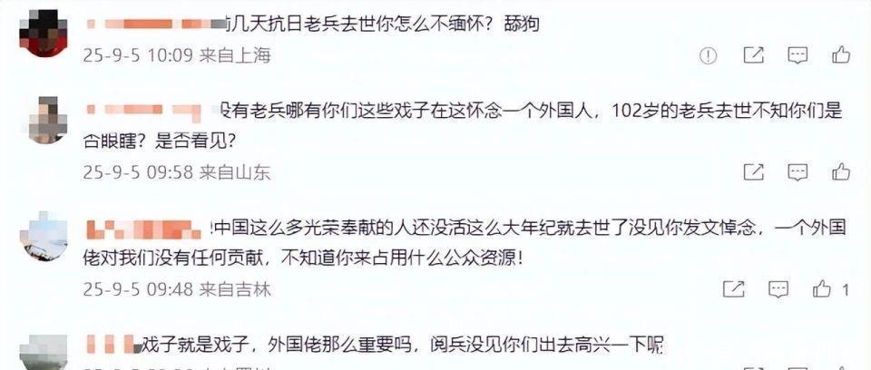 然而在部分网友眼中,这种私人情感表达却成了"崇洋媚外" 的铁证。有人翻出日历质问:"9 月 3 日阅兵式不见你这么上心",更有人尖锐对比:"本国 102 岁老兵去世没见发声,倒急着给外国老头哭丧"。