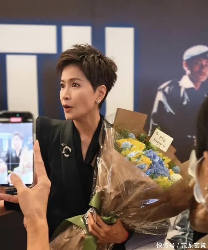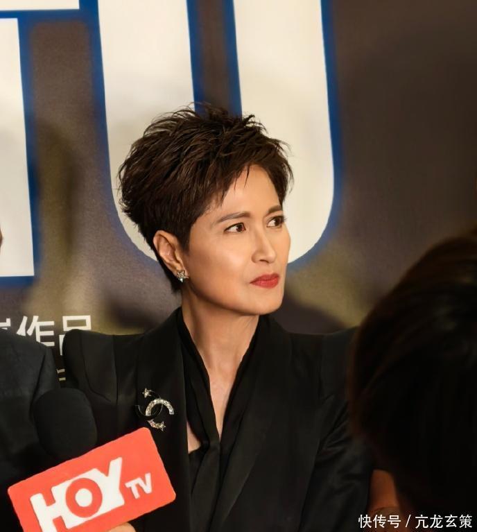 特别是身材保持得那叫一个好,加上帅气利落的短发,搭配一身黑的优雅西装。气质大方,完全不输年轻时候。