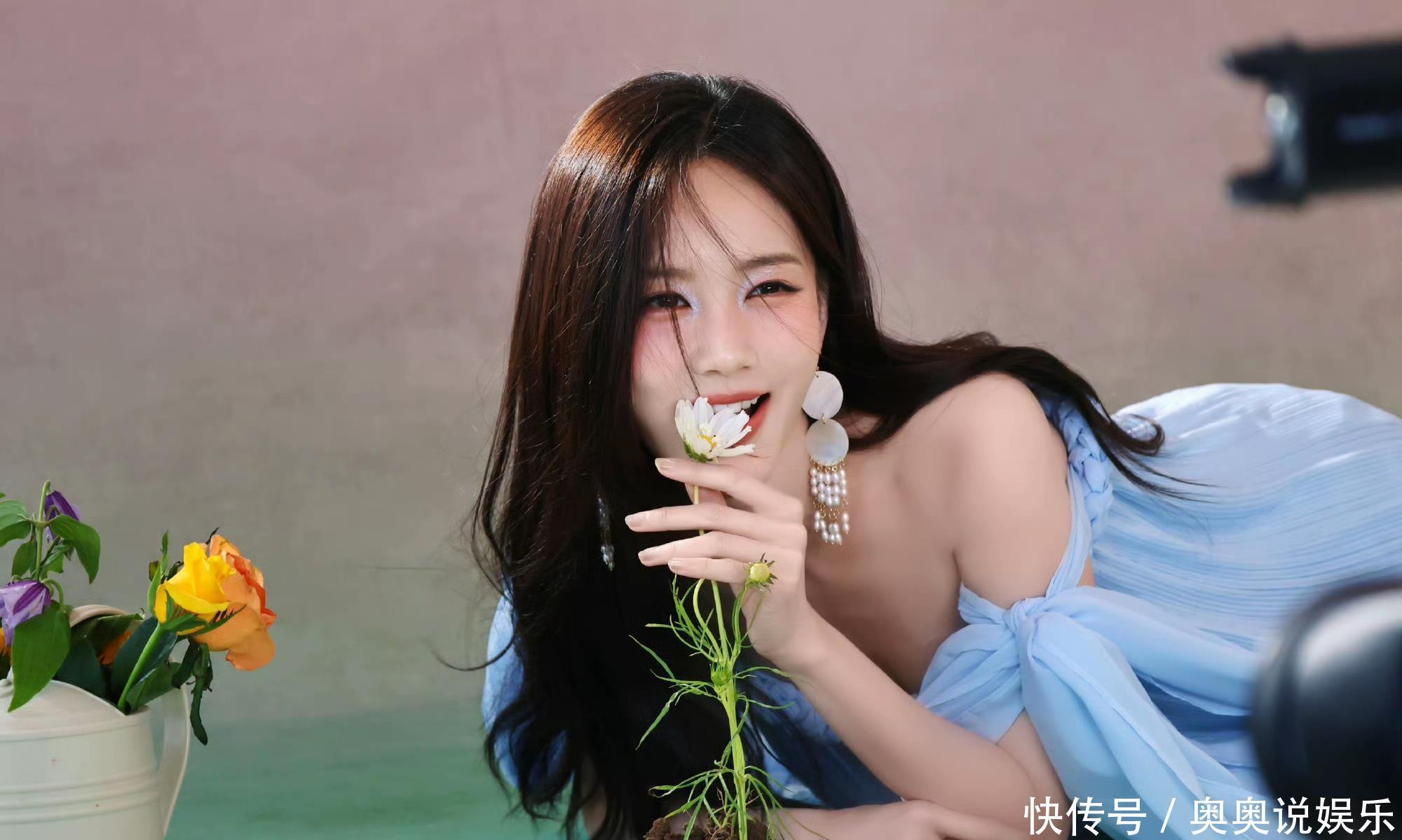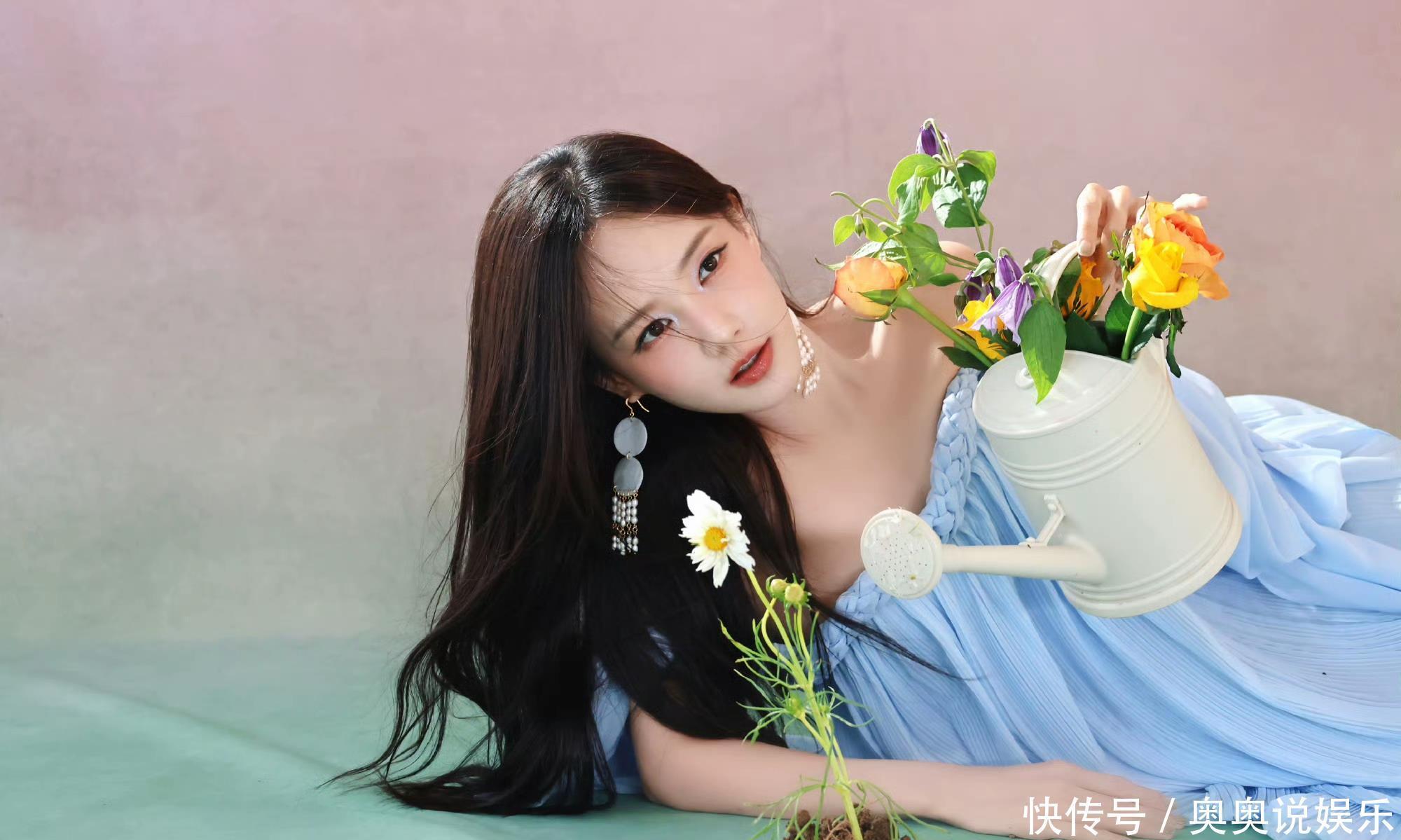 她穿著淺藍(lán)長裙躺在草地上,身旁被鮮花圍繞著,看上去特別的清新唯美。