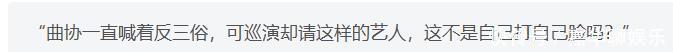 甚至有觀眾當(dāng)場(chǎng)就罵出了聲,演出結(jié)束后,網(wǎng)友們紛紛表示了自己的看法。有人說:“曲協(xié)一直喊反三俗,巡演居然找了這樣的人,真是自己打自己的臉!”。