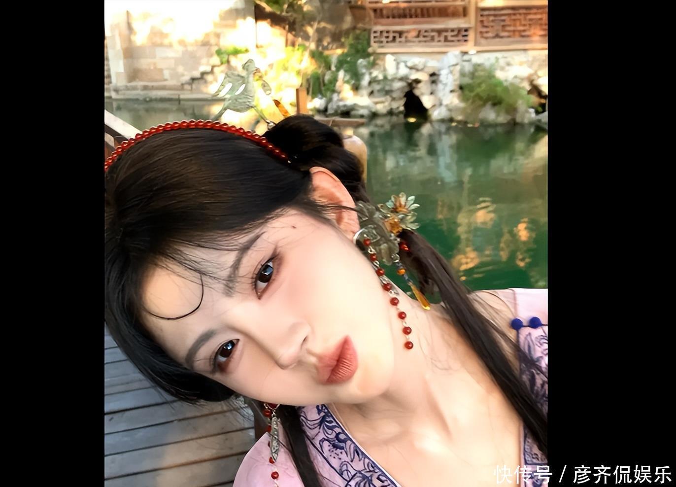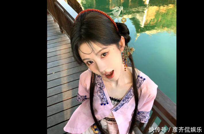鞠婧祎粉色襦裙,嘟嘴甜笑,少女感十足!