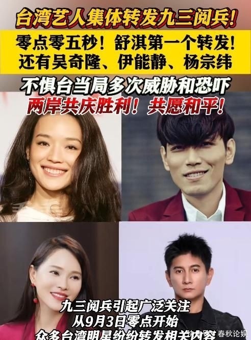 還有一些臺(tái)灣籍藝人如舒淇、吳奇隆、伊能靜等雖未收到邀請(qǐng)函,但也通過(guò)社交平臺(tái)轉(zhuǎn)發(fā)內(nèi)容慶祝九三閱兵。