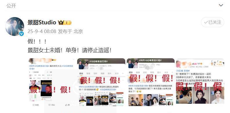 不僅如此,更讓人無(wú)語(yǔ)的是,所謂的“官宣”內(nèi)容全來(lái)自非認(rèn)證的野雞營(yíng)銷(xiāo)號(hào),文案不僅高度雷同,字里行間的話術(shù)如出一轍,明眼人一看便知是批量復(fù)制的水軍。整個(gè)事件從頭到尾都透著“荒誕”,馮紹峰與景甜最近既沒(méi)有新作品要上,私下里也毫無(wú)交集,連社交平臺(tái)的互動(dòng)都為零。既無(wú)合作契機(jī),也無(wú)私下往來(lái),偏偏在這個(gè)時(shí)間點(diǎn)被硬湊成“新婚夫妻”。實(shí)在讓人摸不著頭腦。難免讓人猜測(cè):這難道是被資本或某方勢(shì)力刻意做了局?就在謠言愈演愈烈之際,景甜工作室率先出手,甩出九宮格血紅大字:“假!景甜女士未婚!單身!請(qǐng)停止造謠!”態(tài)度之堅(jiān)決,措辭之強(qiáng)硬,瞬間讓不少吃瓜群眾冷靜下來(lái)。
