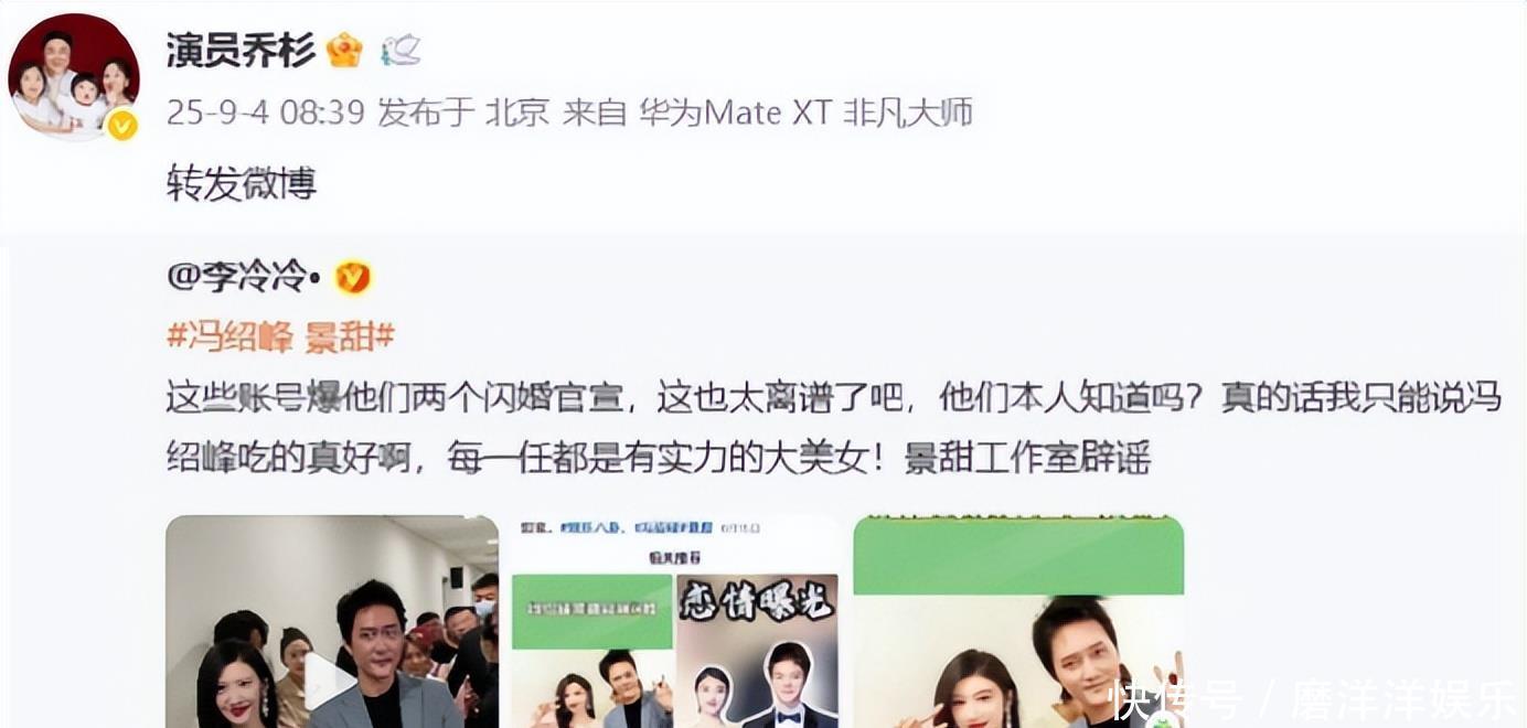 沒(méi)過(guò)多久,馮紹峰方也同步回應(yīng):“假!無(wú)中生有,不信謠,不傳謠!”徹底擊碎了這場(chǎng)鬧劇。這場(chǎng)可笑的鬧劇也不是第一次發(fā)生在馮紹峰身上了,前有他與趙麗穎“復(fù)婚”的消息,后有趙麗穎與陳偉霆“戀情曝光”,如今輪到景甜,網(wǎng)友直呼“太離譜”。更具戲劇性的是,演員喬杉曾轉(zhuǎn)發(fā)相關(guān)博文后又秒刪,連圈內(nèi)人都一度信以為真,足見(jiàn)謠言的傳播力。而造謠賬號(hào)至今未刪除不實(shí)視頻,仍保留著“馮紹峰景甜官宣閃婚”的內(nèi)容。
