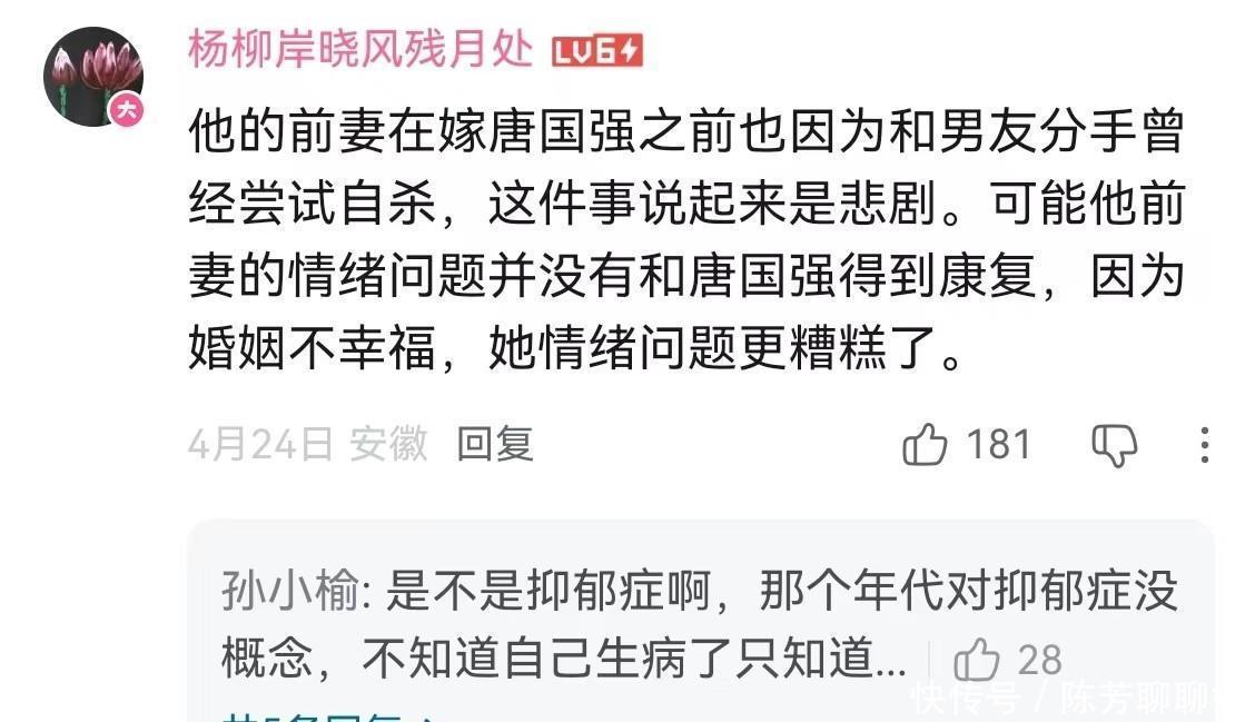 至于孫濤留下的遺書(shū),是孫家時(shí)隔十四年的單方面出具,本就真假難辨,事實(shí)真相究竟如何,外人可能永遠(yuǎn)無(wú)法得知。唐國(guó)強(qiáng)是否出軌,年代久遠(yuǎn),很多東西無(wú)從考證,但能確定的點(diǎn)是,唐國(guó)強(qiáng)和前妻79年結(jié)婚,83年生下女兒,89年離婚,90年妻子自殺。妻子患有嚴(yán)重的抑郁癥,唐國(guó)強(qiáng)關(guān)心不夠,執(zhí)意離婚,這在外人看來(lái)應(yīng)該是壓死駱駝的致命稻草。