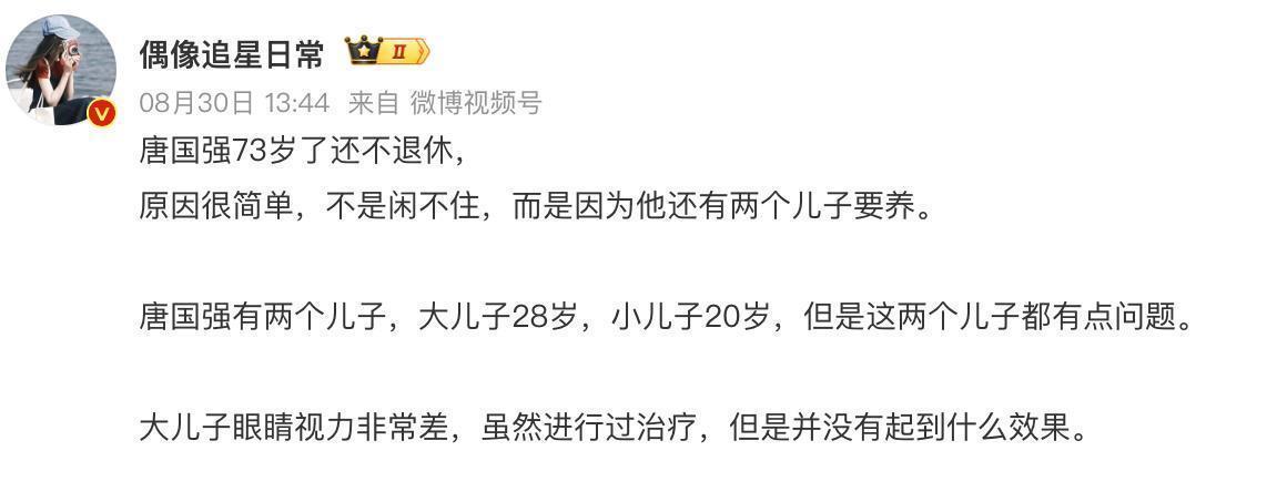 因?yàn)樘茋?guó)強(qiáng)和壯麗的兩個(gè)兒子都或多或少的顯露殘疾癥狀,大兒子唐英涵裸眼視力不足0.1,近乎先天失明,夫妻二人跑遍了各大醫(yī)療機(jī)構(gòu)都不見(jiàn)成效。二兒子唐英集雖然很少為公眾熟知,但唐國(guó)強(qiáng)也多次在公眾場(chǎng)合透露其身體有某部分缺陷的事實(shí),不少人表示這都是唐國(guó)強(qiáng)逼死前妻落下的惡果。二兒子出生后的那一年,唐國(guó)強(qiáng)除了接廣告,還主演了多部影視劇,這一年里他有280天在劇組吃盒飯,60天參加應(yīng)酬活動(dòng),被譽(yù)為演藝圈的“勞?!?。