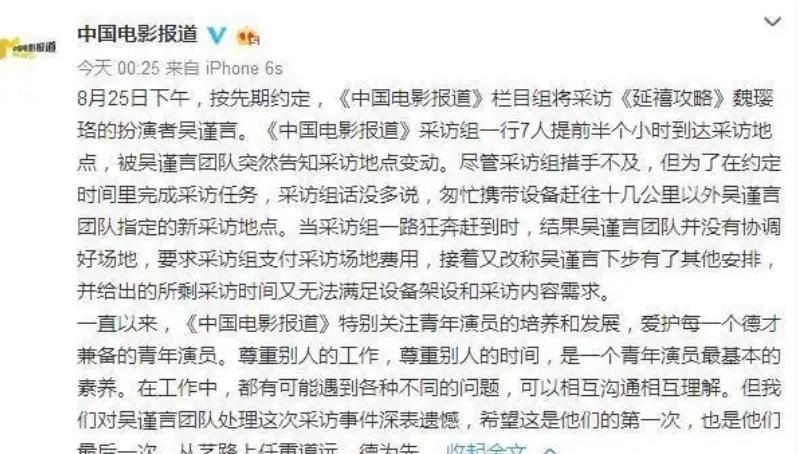 2018日,中国电影报道直接发文点名吴谨言,字里行间都在透露着一个信息:耍大牌。