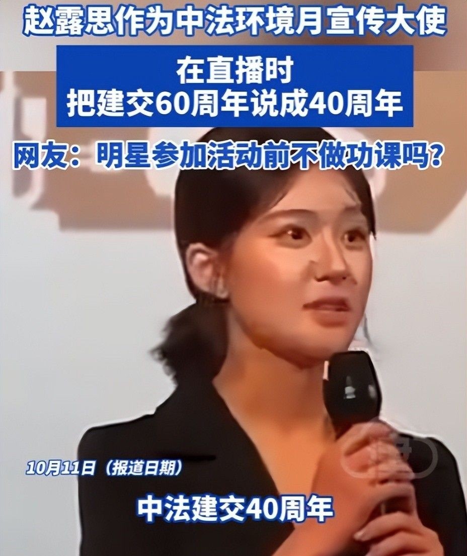 之前在参加活动的时候,赵露思是作为中法环境月宣传大使出现在活动上的,结果在发言的时候,竟然水灵灵的把中法建交的时间给搞错了。