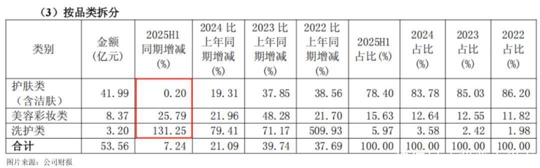 營(yíng)收增幅下滑的主因很大程度上是核心護(hù)膚品收入增長(zhǎng)陷入停滯,今年上半年,公司護(hù)膚品的收入為41.99億元,同比增長(zhǎng)僅0.2%;其中貢獻(xiàn)了公司約74.27%收入的核心品牌珀萊雅收入為39.79億元,同比下滑0.08%。